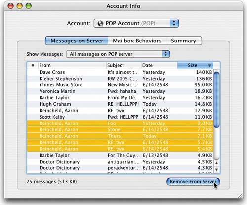 | Is your email server's mailbox full? You can quickly delete old or unwanted email right from within Mail (rather than having to access your mail server directly). Here's how: First, click on the name of the Mail Account where you want to delete some excess mail, then press Command-I to bring up the Account Info dialog. If it's a standard POP mail account, select the Messages on Server tab to see a list of the email messages stored on your email server. Now select the message you want to delete (Shift-click to select a contiguous group of messages, or if you want to be more selective, Command-click on just the email you want to delete). Once you've got the ones selected you want to delete, just click the Remove From Server button in the lower-right corner of the dialog. That should free up some space, and you're back in business (well, at least you can get more email). |