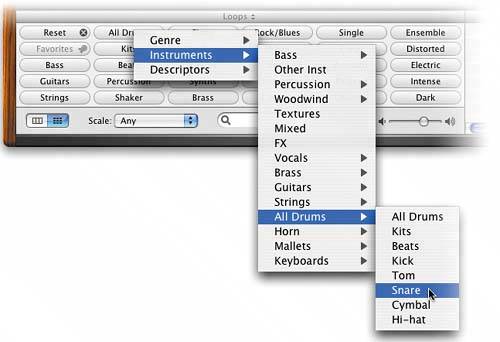 | If you don't like the order of the loop buttons in the Loop Browser, you can easily change them. For example, if you want the Percussion loop button up top, just click directly on that button and drag it to the top row. You can also rename the loop buttons. So if instead of the All Drums loop button, you'd like it to show Snares, just Control-click on the All Drums button, and in the contextual menu that appears go under Instruments, under All Drums, and choose Snare. You can use this same trick to change any Instruments button into either a Genre button or a Descriptors button. |