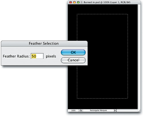 | In the Camera Raw chapter, I showed you how to add vignetting (burned-in edges) using the Vignette option in the Camera Raw dialog, but to use Photoshop's Camera Raw plug-in, you have to be shooting in RAW mode on your camera. However, if you want to apply a similar technique (a very wide vignette that acts more like a soft light) to your regular photos (JPEG, TIFF, etc.), here's how to do just that: Step OneOpen the photo to which you want to apply a burned-in edge effect. Just so you know, what we're doing here is focusing attention through the use of lightwe're burning in all the edges of the photo (not just the corners, like lens vignetting, which I usually try to avoid), which leaves the visual focus in the center of the image. Step TwoGo to the Layers palette and add a new layer by clicking on the Create a New Layer icon at the bottom of the palette. Press the letter D to set your Foreground color to black, and then fill your new layer with black by pressing Option-Delete (PC: Alt-Backspace). Step ThreePress M to get the Rectangular Marquee tool and drag a selection about 1' inside the edges of your photo. Then, to greatly soften the edges of your selection, go under the Select menu and choose Feather. When the dialog appears, enter 50 pixels for a low-res photo (or 170 pixels for a high-res, 300-ppi photo), and click OK. Step FourNow that your edges have been softened, all you have to do is press Delete (PC: Backspace), and you'll knock a soft hole out of your black layer, revealing the photo on the Background layer beneath it. Now press Command-D (PC: Control-D) to deselect. Note: If the edges seem too dark, you can go to the Layers palette and lower the Opacity of your black layer (in the example shown here, I lowered the Opacity to around 80%). |