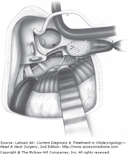 | Note: Large images and tables on this page may necessitate printing in landscape mode. Copyright 2007 The McGraw-Hill Companies. All rights reserved. Current Otolaryngology > XIV. Skull Base > Chapter 66. Neurotologic Skull Base Surgery > | Neurotologic Skull Base Surgery: Introduction Although in widespread use, the term "skull base surgery" is somewhat of a misnomer. Only a minority of such procedures are undertaken to expose lesions actually located primarily within the skull base. Most procedures are conducted to expose deep-seated intracranial lesions situated either adjacent to the brainstem (eg, midbrain, pons, or medulla) or beneath the cerebral cortex . Previously, many such tumors were approached via simple openings in the calvaria, which require vigorous and often injurious degrees of brain retraction. The fundamental principle in transbasal craniotomy is removal of the skull base bone to minimize the need for brain retraction. Although current techniques represent a major enhancement in our ability to control inaccessible tumors while minimizing morbidity, they are not panaceas. For example, experience has shown that these procedures are far more suitable for benign lesions (eg, meningiomas, schwannomas, and paragangliomas) and even for low-grade malignant growths (eg, chordomas and chondrosarcomas) than for high-grade malignant lesions (eg, squamous cell carcinoma, adenocystic carcinoma , and soft tissue sarcomas). Currently, more emphasis is placed on the preservation of function, especially cranial nerves, than on the necessity for radical resection in every case. The value of neurophysiologic nerve monitoring for motor nerves within the surgical field has become well established. In the developmental years of skull base surgery, two-stage procedures were common. More recently, single-stage procedures have become preferred in most centers, even for tumors with sizable intra- and extracranial components , as well as those involving multiple cranial fossae. Computerized imaging modalities provide localizing information that guides the surgeon around vital structures and helps to enable thorough tumor removal. Jung HW, Yoo H, Paek SH, Choi KS. Long-term outcome and growth rate of subtotally resected petroclival meningiomas: experience with 38 cases. Neurosurgery. 2000;46(3):567. [PMID: 10719852] | Kurtsoy A, Menku A, Tucer B, Oktem IS, Akdemir H. Neuronavigation in skull base tumors. Min Invas Neurosurg. 2005;48(1):7. [PMID: 15747210] | | | Temporal Bone Temporal bone resection is a fairly radical operation conducted for malignant disease, particularly squamous cell carcinoma originating in the external auditory canal. Some other indications include adenomatous tumors, such as the aggressive papillary adenocarcinoma of the endolymphatic sac and those arising in salivary tissue (eg, adenocystic carcinoma). In most cases, the lateral portion of the temporal bone housing the ear canal is removed en bloc (Figure 661). The posterior margin consists of the dural lining of the petrous pyramid, which is exposed via mastoidectomy. The anterior margin often includes some or all of the parotid gland and, at times, the mandibular condyle and the temporomandibular joint (Figure 662). Most surgeons remove more deeply involved regions (eg, the cochlea, semicircular canal, and internal auditory canal) piecemeal, using a high-speed drill as resection en bloc risks injury to the internal carotid artery. In advanced lesions, the resection can be carried medially to the internal carotid artery, but its resection is seldom justified. After resection of the condyle, exenteration of the pterygoid muscles , including the third division of the trigeminal nerve to the level of the pterygoid plates, may be accomplished in deeply penetrating lesions. As a general rule, if the facial nerve works preoperatively, a diligent effort should be made to preserve it, although this is not always feasible and engraftment may be needed. Reconstruction of the defect needs to anticipate the need for radiation therapy . Leaving an open cavity increases the risk of osteoradionecrosis. For this reason, the external auditory meatus is typically sewn shut. A rotation flap of temporalis muscle is often desirable to reinforce the closure with well-vascularized tissue. Regional (eg, pectoralis or trapezius) or even free ( rectus abdominis) flaps may be needed for closure in cases where auriculectomy has been required. Jackler RK, Driscoll C. Tumors of the Ear and Temporal Bone. Philadelphia: Lippincott Williams & Wilkins, 2000. | Nyrop M, Grontved A. Cancer of the external auditory canal. Arch Otolaryngol Head Neck Surg. 2002;128(7):834. [PMID: 12117346] | | | Petrous Apex, Petroclival Junction, & Foramen Lacerum Petrous Apicotomy The majority of procedures conducted for disease in the petrous apex involves creation of a narrow drainage pathway that circumnavigates the inner ear. Such procedures, which are usually carried out to drain petrositis or cholesterol granulomas, are best termed petrous apicotomy (Figure 663). In the subcochlear route, a channel is excavated along the floor of the external auditory canal and the hypotympanum, which traverses the narrow window between the cochlea, the carotid genu, and the dome of the jugular bulb. An alternate pathway is the infralabyrinthine approach, conducted between the posterior semicircular canal and the jugular bulb, immediately behind the descending portion of the facial nerve. However, because most apical cysts are located anteriorly medial to the cochlea, the infralabyrinthine route is deeper, more difficult, and creates a less adequate drainage portal. Brackmann DE, Toh EH. Surgical management of petrous apex cholesterol granulomas. Otol Neurotol. 2002;23(4):529. [PMID: 12170157] | Jacob CE, Rupa V. Infralabyrinthine approach to the petrous apex. Clin Anat. 2005;18(6):423. [PMID: 1601561] | Telischi FF, Luntz M, Whiteman ML. Supracochlear approach to the petrous apex: c