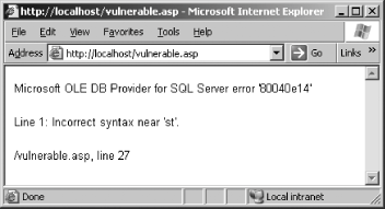 Now that we have our parameter parsing logic in place, we can call whichever specific input validation tests we want to perform. The first of these tests, called sqlTest, detects potential SQL injection points. This subroutine accepts one variable (the request to be used for testing) and returns 1 if the test detects a potential vulnerability or 0 if no vulnerability is detected. We assign the output of sqlTest (the 0 or 1) to a variable called $sqlVuln: my $sqlVuln = sqlTest($paramRequest); 8.4.4.1 sqlTest subroutineBefore we start building the SQL injection testing routine, we must decide what the test should consist of. The most common technique for SQL injection testing involves the use of a single quote (') character inserted into a parameter value. In the absence of any input validation, a single quote, when passed to a database server within a query, typically generates an SQL syntax error unless it is properly escaped. The ability to invoke a database syntax error by inserting a single quote into an application parameter is a very good indication that an SQL injection point might exist. From a testing perspective, any database error message that the user can invoke is something that should be followed up on. As such, our SQL injection test consists of passing a single quote within the parameter being tested to see if the application returns a database error. Recall that the specific parameter value to be tested in each request is prepopulated with a placeholder string before the parameter parsing logic calls the test routine. This saves us some effort because the subroutine automatically knows which parameter value to test based on the presence of the placeholder string. The first thing this subroutine does is accept an input variable (the request) and substitute the placeholder string with our SQL injection string. Because all we need to do is to pass in a single quote, our test string can be something simple, such as te'st: sub sqlTest { my ($sqlRequest, $sqlStatus, $sqlResults, $sqlVulnerable); ($sqlRequest) = @_; # Replace the "---PLACEHOLDER---" string with our test string $sqlRequest =~ s/---PLACEHOLDER---/te'st/;Now that the SQL injection test request is ready, we can hand it off to the makeRequest subroutine and inspect the response. We must define the criteria used to determine whether the response indicates the presence of a vulnerability. We previously decided that the ability to invoke a database error message using our test string is a good indicator that a potential injection point might exist. As such, the easiest way to test the response is to develop a regular expression designed to identify common database errors. We must ensure that the regular expression can identify database error messages from a variety of common database servers. Figure 8-3 shows what one of these error messages typically looks like. Figure 8-3. Common SQL server error message![]() The regular expression used in the following code was designed to match common database server error messages. As you can see, if the response matches our regular expression, we consider the page vulnerable and report the finding: # Make the request and get the response data ($sqlStatus, $sqlResults) = makeRequest($sqlRequest); # Check to see if the output matches our vulnerability signature. my $sqlRegEx = qr /(OLE DB|SQL Server|Incorrect Syntax|ODBC Driver|ORA-|SQL command not|Oracle Error Code|CFQUERY|MySQL|Sybase| DB2 |Pervasive|Microsoft Access|MySQL|CLI Driver|The string constant beginning with|does not have an ending string delimiter|JET Database Engine error)/i; if (($sqlResults =~ $sqlRegEx) && ($oResponse !~ $sqlRegEx)) { $sqlVulnerable = 1; printReport("\n\nALERT: Database Error Message Detected:\n=> $sqlRequest\n\n"); } else { $sqlVulnerable = 0; }Additionally, note that we are also ensuring that the original response, made before we started testing (the $oResponse variable), does not match our regular expression. This helps to reduce the likelihood of reporting a false positive, because the normal request content matches our regular expression (recall the scenario involving the product description page for software "designed to integrate with SQL Server"). Now that we have performed our test, we assign a value to the $sqlVulnerable variable to indicate whether the request detected a database error message. The final action for our subroutine is to return this variable. Returning 1 indicates that the request is potentially vulnerable; 0 indicates it is not: # Return the test result indicator return $sqlVulnerable; } Now that our SQL injection testing has been performed, we continue with our per-variable tests. Turning back to our main script routine, you'll recall we are in the midst of looping through each request variable, so we must perform the remaining per-variable tests before we continue. The next and last per-variable test to be performed is designed to detect possible XSS exposures. The subroutine for this test is called xssTest and it is structured in a way that is very similar to sqlTest. As before, we declare a new variable ($xssVuln) to assign the value returned (0 or 1) by xssTest: my $xssVuln = xssTest($paramRequest); 8.4.4.2 xssTest subroutineTo test for XSS, we inject a test string containing JavaScript into every test variable and check to see if the string gets returned in the HTTP response. A simple JavaScript alert such as the one shown here produces an easily visible result in the web browser if successful: <script>alert('Vulnerable');</script>One thing we must consider is that many XSS exposures result from HTML form fields that are populated with request parameter values. These values are typically embedded within an existing HTML form control, so any effective exploit string needs to "break out" of the existing HTML tag. To compensate for this, we modify our test string as follows: "><script>alert('Vulnerable');</script>Now that we have designed our test string, we can build t