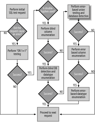To allow for more generic error identification, all we do in this subroutine is flag the potential vulnerability, classify it based on the suspicious attribute we observe, and continue additional testing: # Check to see if the output matches our vulnerability signatures. if (($sqlResults =~ $sqlRegEx) && ($oResponse !~ $sqlRegEx)) { $sqlVulnerable = 1; printReport("\n\nALERT: Database Error Message Detected:\n=> $sqlRequest\n\n"); } elsif (($sqlStatus =~ /^500/) && ($oStatus !~ /^500/)) { $sqlVulnerable = 2; printReport("\n\nALERT: 500 Error Code Detected:\n=> $sqlRequest\n\n"); } elsif (($sqlResults =~ /error|unable to|cannot/i) && ($oResponse !~ /error|unable to/i)) { $sqlVulnerable = 3; printReport("\n\nALERT: Generic Error Message Detected:\n=> $sqlRequest\n\n"); } elsif (length($sqlResults) < 100 && length($oResponse) > 100) { $sqlVulnerable = 4; printReport("\n\nALERT: Small Response Detected:\n=> $sqlRequest\n\n"); } else { $sqlVulnerable = 0; }As you can see here, we use the $sqlVulnerable variable (declared at the top of our script) to identify whether one of four possible error attributes was observed in the response. Table 9-1 provides a listing of each error attribute and its associated value ($sqlVulnerable).
