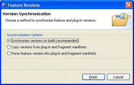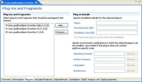 18.1. Feature ProjectsThe Favorites example includes three projects"Favorites Plug-in," "Favorites Help," and "Favorites NLS Fragment"that you would like to combine together into a single feature. 18.1.1. Creating a new feature projectTo create the new feature, you will begin by using the New Project wizard to create a new Feature Project (see Figure 18-2). Figure 18-2. The New Project wizard. On the first page of the New Feature wizard (see Figure 18-3), enter "com.qualityeclipse.favorites.feature" as the project name. Click the Next button. Figure 18-3. The New Feature wizard. On the second page of the wizard (see Figure 18-4), change the feature ID to "com.qualityeclipse.favorites" so that it matches the ID of the main plug-in. This is important because the generally accepted practice in the Eclipse world is to locate feature branding files (such as about.ini and about. properties) in the plug-in with the same ID as the feature (as you will see a bit later, this is not strictly requiredsee Section 18.1.3, Feature manifest editor, on page 624). Figure 18-4. Feature Properties page of the New Feature wizard. A couple of other fields should be filled in on this page as well: Change the Feature Name to "Favorites Feature"; leave the Feature Version set to "1.0.0"; and set the Feature Provider to "QualityEclipse". The section at the bottom of this page deals with setting up a custom install handler. This is an advanced feature, which won't be covered in this book. Leave those settings unchanged and click the Next button. On the last page of the wizard (see Figure 18-5), you will see a list of all the loaded plug-ins and fragments defined in your workspace along with their version numbers. Find the two plug-ins and one fragment created earlier and select them. Click Finish to create the project and generate the feature manifest file. Figure 18-5. Referenced Plug-ins and Fragments page of the New Feature wizard. 18.1.2. Feature manifest filesThe wizard created a single file of interest: the feature manifest file. Based on the options selected in the wizard, the feature manifest file (feature.xml) will look like this: <?xml version="1.0" encoding="UTF-8"?> <feature label="Favorites Feature" version="1.0.0" provider-name="QualityEclipse"> <description url="http://www.example.com/description"> [Enter Feature Description here.] </description> <copyright url="http://www.example.com/copyright"> [Enter Copyright Description here.] </copyright> <license url="http://www.example.com/license"> [Enter License Description here.] </license> <plugin download-size="0" install-size="0" version="0.0.0"/> <plugin download-size="0" install-size="0" version="0.0.0"/> <plugin download-size="0" install-size="0" version="0.0.0" fragment="true"/> </feature> The structure is fairly simple. At the beginning of the file, you will find the id, label, version, and provider-name attributes. The description, copyright, and license sections contain information meant to be presented to the user of the feature. The remainder of the file lists the individual plug-ins and fragments that compose this feature. Each plug-in is identified by its plug-in ID, and the version attribute specifies the specific version of the plug-in that is part of this feature. In general, the version numbers of the included plug-ins should match the version number of the feature. Having the fragment attribute set to true identifies any included fragments. 18.1.3. Feature manifest editorThe feature manifest generated by the wizard contains the barest essential elements needed to define a feature. Numerous other attributes can be defined to enhance a feature. The feature manifest editor provides a convenient interface for editing the existing attributes of a feature or adding new attributes. Double-clicking on the feature manifest file, feature.xml, will open the feature manifest editor (see Figure 18-6). The editor looks very similar to the plug-in manifest editor with Overview, Information, Plug-ins, Included Features, Dependencies, Installation, Build, feature.xml, and build.properties pages. Figure 18-6. Feature manifest editor. There are a lot of things happening on this page. Initially, the ID, Version, Name, and Provider fields will be filled in based on inputs to the wizard pages. There are other fields to make note of here. Branding Plug-in contains the name of the plug-in that will contain the feature branding files. Use the Browse... button to select the main plug-in or manually change the value to "com.qualityeclipse.favorites" so that it matches the ID of the main plug-in. The Update Site URL and Update Site Name fields are used to specify the Web address and name of the update site that will be used to load the feature using the Eclipse Update Manager. When the Update Manager is looking for updates to your plug-in, it will look at the sites defined by your update URLs. This is discussed in more detail in Section 18.3, Update Sites, on page 637. For most plug-ins written against the public Eclipse API, portability to different Eclipse platforms won't be a problem. Eclipse does not prevent you, however, from making use of platform-specific functionality (such as ActiveX support under Windows). In situations like that, you need to be able to specify which environments are appropriate for your plug-in. In the Supported Environments section, you can supply a comma-separated list of valid values for Operating Systems, Window Systems, Languages, and Architecture. Clicking on the Browse... button to the right of each field will open a selection dialog appropriate to the chosen environment type. For example, the choices available for Operating Systems include aix, hpux, linux, macosx, qnx, solaris, and win32 (see Figure 18-7). Figure 18-7. Portability Choices for operating systems. On the right side of the page, the Exporting section includes a couple of interesting options. The Synchronize button is used to synchronize the version numbers of the i
