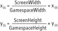 | It's time to see floating-point numbers in action. To see how they work, you'll do a case study that simulates the firing of a cannon. This simulation is more like real games than the example programs shown so far because it uses floating-point numbers for all of its calculations. The objects in the simulation will also be positioned using floating-point numbers. As you've already seen, computer screens use integers rather than floating-point numbers. So if all of the simulation's calculations and object positions are in floating-point numbers, how do you connect that to integer locations on the screen? The answer is that you use a gamespace. What is a Gamespace?A gamespace is a virtual world that all of a game's objects exist in. The gamespace can be any size. It can use any unit of measure. So, for instance, programmers who like the English system can use inches, feet, yards, and miles. Programmers who prefer the metric system can define their gamespaces using centimeters, meters, and kilometers. In real games, gamespaces are almost always defined using floating-point numbers. This enables them to do much more accurate and realistic physics calculations. In the case study of the cannon, the program must perform calculations that simulate the movement of a cannonball. If it were to use only integers, it would probably not look very realistic because of inaccuracies in the physics calculations. Instead, the cannon simulation creates a gamespace that uses vectors containing floating-point numbers. This enables more accurate calculations than integer vectors. When your game uses a gamespace, it must convert the locations of objects from floating-point game coordinates into integer screen coordinates. This is illustrated in Figure 9.4. Figure 9.4. The gamespace on the left contains the game's objects. The images of the objects are drawn in the screen space at the right. Figure 9.4 shows that the gamespace for the cannon simulation is 10,560 feet (2 miles) wide. The screen resolution is set so that the screen is 800 pixels wide. The position of the cannonball that's in flight is defined in the gamespace with floating-point numbers. The same is true of the cannon's position. During each frame, the position of the cannon and cannonball must be converted to integer screen coordinates so that the cannon and the ball can be rendered at the correct locations on the screen. Factoid Another common name for game coordinates is world coordinates because the gamespace can be called a world. To convert from gamespace coordinates to screen space coordinates, you use the formulas shown in Figure 9.5. Figure 9.5. Converting coordinates from the gamespace to the screen space. In the equations in Figure 9.5, the term xSS stands for the x value in the screen space. The term xGS is the x value in the gamespace. Likewise, ySS and yGS represent the y values in the screen space and the gamespace, respectively. As the first equation in Figure 9.5 shows, you convert x values in the gamespace to screen space by dividing the width of the screen in pixels by the width of the gamespace. In our cannon example, the height of the gamespace is in feet (10,560.0 feet to be exact). Next, you multiply the result by the x coordinate in the gamespace. Similarly, you convert y values in the gamespace to screen space by dividing the height of the screen in pixels by the width of the gamespace. In the cannon example, the width of the gamespace is 7920.0 feet. You multiply the result of the division by the y value in the gamespace. Tip I've defined the gamespace for the cannon simulator in English units (feet). However, if you're serious about game programming, I strongly encourage you to become familiar with the metric system if you're not already. You'll find that almost all physics calculations are easier using the metric system. Converting from screen space coordinates to gamespace coordinates uses the formula in Figure 9.6. Figure 9.6. Converting coordinates from the screen space to the gamespace. As with the equation in Figure 9.5, the term ySS in Figure 9.6 stands for the y value in the screen space. The term yGS is the y value in the gamespace. The terms xSS and xGS represent the x values in the screen space and the gamespace. Writing a Vector Class that Uses Floating-Point NumbersMost gamespaces define the positions and movements of objects using floating-point numbers for greater accuracy. This requires the use of vectors containing floating-point numbers. LlamaWorks2D provides a floating-point vector class called vectorf Listing 9.1 gives the class definition for the vectorf class. Listing 9.1. The vectorf class