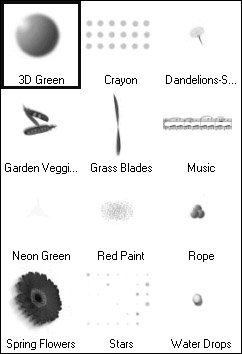 Paint Shop Pro’s picture tubes, some of which can be seen in Figure 15.14, are one of its best features because they allow you to paint with a variety of preexisting objects. You can add everything from raindrops to flowers to an image very quickly. There are hundreds of picture tubes available on the Internet, or you can use the ones that come with the program. You can even design your own with Paint Shop Pro.