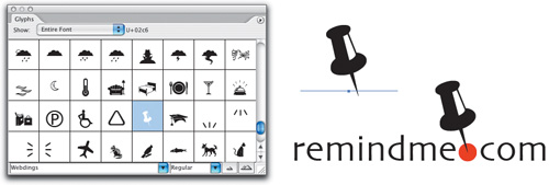 | Stuck for a design idea, or searching for some clip art? Why not check out your built-in symbol fonts such as Webdings, Dingbats, etc.? Get the Type tool (T) and click-and-drag out a text box. Choose a font type and pick a large size. Open the Glyphs palette (Window>Type>Glyphs) and use this palette to pick the shape (letter) you want to use. Once you've found a design you like, double-click on it to add it to the text box. Then, select the symbol in the text box with the Selection tool and from the Type menu, choose Create Outlines (or press Command-Shift-O [PC: Control-Shift-O]). Use the Direct Selection tool (A) to edit and work with the object(s). |