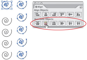 | You've created a bunch of objects, with nice even spaces between them, then you decide that the top object needs to be up higher. You move the top object and, of course, the other objects are no longer evenly spaced. The solution? Select all the objects and in the Align palette (Window>Align), click the Horizontal or Vertical Distribute icons. |