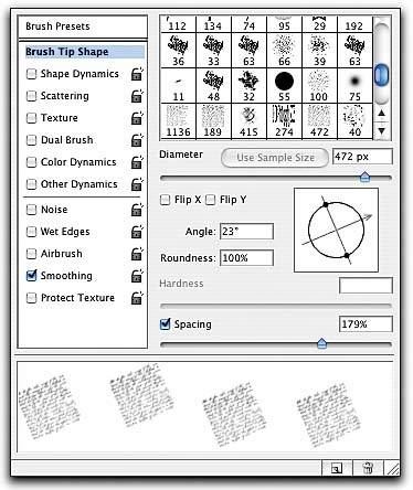 By the way, if you use the Brushes palette (it's nested in the Palette Well), you can alter any of the brushes you've defined. Here I clicked on Brush Tip Shape and changed the angle of rotation. Then I made the brush larger and clicked once to paint on a new layer. Finally, I changed the layer blend mode to Lighten and lowered the Opacity to 40%.
