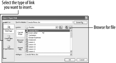 Lesson 11.8. Using Hyperlink Fields Figure 11-14. The Insert Hyperlink dialog box. In this lesson, you will learn about how to use hyperlinks in Microsoft Access. A hyperlink can point to any file on your computer, on the network, or even on a Web page on the Internet. Whenever you click on a hyperlink, you jump to the hyperlink's destination (if it's available). A hyperlink is usually indicated by colored and underlined text. If you have ever been on the World Wide Web, you've used hyperlinks all the time to move between different Web pages. Microsoft recognized the importance of the Internet and thus introduced the new hyperlink field type in Access 2003. You can use the hyperlink field to store clickable links to files on your computer or network or to Web pages on the Internet. In this lesson you will learn how to use to create links that point to files on your network or on the Internet. Select the tblTours table and click the Design button. First we need to add a hyperlink field to this table. Click the first blank Field Name row and type Link. Click the Data Type list arrow and select Hyperlink from the list. You've just created a hyperlink field! Save your changes and then click the View button on the toolbar to display the table in Datasheet view. Let's try adding a hyperlink to the Western Canada record. Click in the Link field for the Western Canada record and click the Insert Hyperlink button on the toolbar. Tip: Another way to insert a hyperlink is to select Insert The Insert Hyperlink dialog box appears, as shown in Figure 11-14. This is where you will specify the name and location of the file or Web page you want to add as a hyperlink. If you know the location and name of the file or Web address, you can type it directly in the dialog box; otherwise, you can use the Browse button to locate the file. Click the Browse for File button. The Link to File dialog box appears and displays a list of files that you can use as the destination for your hyperlink. Browse to your Practice folder, then find and double-click the Canada Memo document. The Link to File dialog box closes, and the name and location of the Canada Memo is added to the Address box. Click OK. The dialog box closes and you return to the datasheet. Notice that the text "Canada Memo.doc" appears blue and underlined, signifying that it's a hyperlink. Let's see how our new hyperlink works. Click the Canada Memo.doc hyperlink. You immediately jump to the hyperlink's destinationin this case, the Canada Memo document. Note: If a dialog box appears, warning you that hyperlinks can be harmful to your computer and data, click Yes to continue.