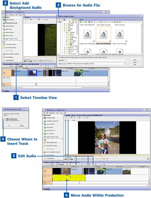 To spice up your video production, you'll want to add audio to it. You can add any audio file on your computer or you can rip one from a CD. Although you can do some basic editing of your audiosuch as splitting or clipping the track and adjusting the volumewithin VideoWave, you'll want to do any major editing in Sound Editor before importing your audio into a video production.
