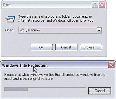 Figure 4-14. Running the Windows XP System File Check  The Windows XP System File Check (SFC) utility will examine all the Windows system files on your computer. If it detects corrupted or missing files, it will replace them with the original correct files. It can take 20 to 30 minutes or so to finish, so be patient. You might need your original Windows XP installation CD handy because you might not have all the proper utility files loaded on your computer; in which case, you will be prompted for files that are on that CD.