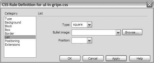The values in the Position menu determine the placement of the leading character, be it a bullet, number, or letter. The Inside value refers to inside the margin of the list, while Outside refers to outside the margin of the list. Of course, with CSS, you can change everything else about the presentation of the list, too. Browse the other categories of the CSS Rule Definition dialog box to change the font, the weight, the color, the type size, and so on.