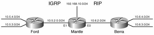 The OSPF configuration of Lajoie is in Example 11-13 Example 11-13. Lajoie's OSPF configuration shows the redistribution of EIGRP routes into OSPF.router ospf 1 redistribute eigrp 1 metric 30 metric-type 1 subnets network 172.20.11.2 0.0.0.0 area 0 This configuration redistributes routes discovered by EIGRP process 1 into OSPF process 1. The metric portion of the command assigns an OSPF cost of 30 to each redistributed route. The redistribution makes Lajoie an ASBR in the OSPF domain, and the redistributed routes are advertised as external routes. The metric-type portion of the command specifies that the external type of the routes is E1. The subnets keyword, used only when redistributing routes into OSPF, specifies that subnet details will be redistributed. Without it, only major network addresses are redistributed. More will be said about the subnets keyword in the case studies. An alternative method of specifying the metrics to be assigned to redistributed routes is to use the default-metric command. For example, the previous OSPF configuration can also be written as in Example 11-14. Example 11-14. Lajoie's OSPF configuration uses the default-metric command to assign an OSPF metric to all routes redistributed into OSPF.router ospf 1 redistribute eigrp 1 metric-type 1 subnets default-metric 30 network 172.20.11.2 0.0.0.0 area 0 The results of this configuration are exactly the same as the previous configuration. The default-metric command is useful when routes are being redistributed from more than one source. For example, suppose router Lajoie in Figure 11-7 was running not only EIGRP and OSPF but also RIP. The OSPF configuration might be as displayed in Example 11-15. Example 11-15. Lajoie's OSPF configuration uses the default-metric command to assign an OSPF metric to routes redistributed from both EIGRP and RIP.router ospf 1 redistribute eigrp 1 metric-type 1 subnets redistribute rip metric-type 1 subnets default-metric 30 network 172.20.11.2 0.0.0.0 area 0 Here an OSPF cost of 30 will be assigned to all EIGRP- and RIP-learned routes. The two methods of assigning metrics can also be used with each other. For example, suppose Lajoie were to be configured to redistribute OSPF and RIP into EIGRP, but that RIP routes were to be advertised with a different set of metrics than the OSPF routes. The configuration might be like Example 11-16. Example 11-16. Lajoie's EIGRP configuration uses a metric with the redistribution command to assign metrics to addresses redistributed from RIP, and uses the default metric command to assign the EIGRP metric to all other redistributed addresses.router eigrp 1 redistribute ospf 1 redistribute rip metric 50000 500 255 1 1500 default-metric 10000 100 255 1 1500 passive-interface Ethernet1 network 172.20.0.0 The metrics assigned using the metric keyword with the redistribute command take precedence over metrics assigned with the default-metric command. RIP-learned routes will be advertised into EIGRP with the metrics specified on the redistribute rip line, and the OSPF-learned routes will be advertised with the metrics specified by the default-metric command. If neither the metric keyword nor the default-metric command specifies a metric, the metric will default to 20 for routes redistributed into OSPF and to 0 for routes redistributed into other protocols. The 0 metric will be understood by IS-IS, but not by RIP, whose hop count must be between 1 and 16. The 0 metric is also incompatible with the EIGRP multi-metric format. These two protocols must have the appropriate metrics assigned to any redistributed routes, or redistribution will not work. The following case studies examine techniques for configuring redistribution into the various IP IGPs. In addition, they are arranged so that the more generic issues of redistributing classful to classful, classless to classless, and classless to classful can be examined. Case Study: Redistributing IGRP and RIPIn the network of Figure 11-8, Ford is running IGRP, and Berra is running RIP. Mantle's routing configuration is shown in Example 11-17. Figure 11-8. Ford is running IGRP, and Berra is running RIP. Mantle is performing redistribution. Example 11-17. Mantle is running both IGRP and RIP and performing redistribution between the two protocols, using both the default metric and the metric assigned with the redistribution command.router rip redistribute igrp 1 metric 5 passive-interface Ethernet1 network 10.0.0.0 ! router igrp 1 redistribute rip default-metric 1000 100 255 1 1500 passive-interface Ethernet0 network 10.0.0.0 Both methods of assigning metrics are used here for demonstration purposes. In most cases, a redistribution scheme as simple as this will use one method or the other. Notice that Mantle is also connected to a stub network (192.168.10.0/24). In this case, the stub network should be advertised into the IGRP domain, but not into the RIP domain. One way to accomplish this configuration is to simply add the appropriate network statement under IGRP. However, doing so will create unnecessary IGRP broadcasts on the stub network. Another way to achieve the desired configuration is to use redistribution as in Example 11-18. Example 11-18. Mantle redistributes the connected stub network into IGRP.router rip redistribute igrp 1 metric 5 passive-interface Ethernet1 network 10.0.0.0 ! router igrp 1 redistribute connected redistribute rip default-metric 1000 100 255 1 1500 passive-interface Ethernet0 network 10.0.0.0 The redistribute connected command will redistribute all directly connected networks. If network 192.168.10.0/24 is to be advertised into the IGRP domain and the RIP domain, the configuration would be as in Example 11-19. Example 11-19. Mantle's configuration shows the connected stub network advertised into both RIP, assigning the metric during redistribution, and IGRP, assigning the metric using the default metric command.router rip redistribute connected metric 5 redistribute igrp 1 metric 5 