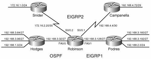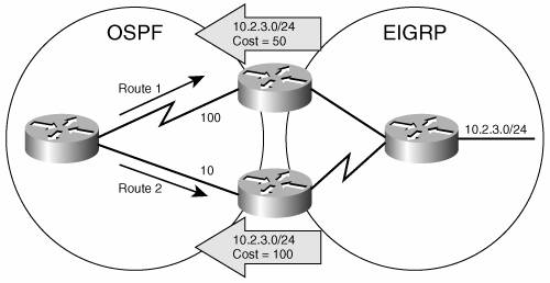 For example, the EIGRP configuration of Lajoie in Figure 11-7 is displayed in Example 11-12. Figure 11-7. Configuring redistribution sample network. Example 11-12. Lajoie's EIGRP configuration shows OSPF being redistributed into the EIGRP process.router eigrp 1 redistribute ospf 1 metric 10000 100 255 1 15003 passive-interface Ethernet1 network 172.20.0.0 This configuration redistributes routes discovered by OSPF process 1 into EIGRP process 1. The metric portion of the command assigns EIGRP metrics to the routes. In order, the numbers specify the following: