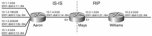 Example 11-33. Robinson's route table. Because the router is originating many summary routes, there are many entries for summaries whose connected interface is Null0. This is a safeguard against routing loops.Robinson#show ip route Codes: C - connected, S - static, I - IGRP, R - RIP, M - mobile, B BGP D - EIGRP, EX - EIGRP external, O - OSPF, IA - OSPF inter area N1 - OSPF NSSA external type 1, N2 - OSPF NSSA external type 2 E1 - OSPF external type 1, E2 - OSPF external type 2, E EGP i - IS-IS, L1 - IS-IS level-1, L2 - IS-IS level-2, ia - IS-IS inter area * - candidate default, U - per-user static route, o ODR P - periodic downloaded static route Gateway of last resort is not set 172.16.0.0/16 is variably subnetted, 3 subnets, 3 masks C 172.16.2.20/30 is directly connected, Serial0/0.2 D 172.16.0.0/16 is a summary, 00:19:44, Null0 D 172.16.1.0/24 [90/2195456] via 172.16.2.22, 00:17:08, Serial0/0.2 192.168.4.0/24 is variably subnetted, 3 subnets, 3 masks D 192.168.4.72/29 [90/2172416] via 192.168.4.6, 00:15:17, Serial0/0.1 C 192.168.4.4/30 is directly connected, Serial0/0.1 D 192.168.4.0/24 is a summary, 00:20:53, Null0 O 192.168.1.0/24 [110/74] via 192.168.3.34, 00:21:14, FastEthernet0/0 D 192.168.2.0/24 [90/665600] via 192.168.3.130, 00:19:41, FastEthernet0/1 192.168.3.0/24 is variably subnetted, 8 subnets, 3 masks O 192.168.3.96/27 [110/74] via 192.168.3.34, 00:21:15, FastEthernet0/0 O 192.168.3.64/27 [110/74] via 192.168.3.34, 00:21:15, FastEthernet0/0 C 192.168.3.32/27 is directly connected, FastEthernet0/0 D 192.168.3.0/24 is a summary, 00:19:01, Null0 D 192.168.3.0/25 is a summary, 00:19:47, Null0 D 192.168.3.192/27 [90/665600] via 192.168.3.130, 00:19:42, FastEthernet0/1 D 192.168.3.160/27 [90/665600] via 192.168.3.130, 00:19:42, FastEthernet0/1 C 192.168.3.128/27 is directly connected, FastEthernet0/1 D 192.168.0.0/16 is a summary, 00:19:00, Null0 Robinson#Summary routes to null interfaces are very helpful for preventing loops, and their use is described in greater detail in Chapter 12, "Default Routes and On-Demand Routing." However, the redistribution of incorrect routing information should not be allowed to happen at all. Suppose that instead of being one hop away from Robinson, Podres is 10 hops away. The misdirected packet would have to travel a long way before being dropped. This example demonstrates the need to carefully regulate route advertisements when using mutual redistributionthat is, when two routing protocols are redistributing their routes into each other. In such cases the use of route filters, described in Chapter 13, "Route Filtering," or route maps, as described in Chapter 14, "Route Maps," is essential. The previous scenario also demonstrates the trade-off of using summarization. Although the size of the route table is reduced, saving memory and processor cycles, route precision is also reduced. As the network grows more complex, that loss of detail increases the possibility of routing errors. Case Study: Redistributing OSPFv3 and RIPngIPv6 is running on the network in Figure 11-11. Router Griffey is the connection point between three distinct networks. Two networks are running OSPFv3, the other is running RIPng. Routes are redistributed between the routing processes by Griffey. Figure 11-11. IPv6 is being routed with both OSPFv3 and RIPng, and a single router is redistributing between the routing protocols. Griffey's configuration is displayed in Example 11-34. Example 11-34. Griffey is configured with IPv6, OSPFv3 process 1, OSPFv3 process 2, and RIPng, and is redistributing between the processes.interface Ethernet 0/0 ipv6 address 2001:db8:0:21::1/64 ipv6 rip Mariners enable ! interface Serial 0/0.1 point-to-point ipv6 address 2001:db8:0:31::1/64 ipv6 ospf 1 area 1 ! interface Serial 0/0.4 point-to-point ipv6 address 2001:db8:0:30::1/64 ipv6 ospf 2 area 20 ! ipv6 router ospf 1 redistribute rip Mariners metric-type 1 tag 4 ! ipv6 router ospf 2 redistribute rip Mariners ! ipv6 router rip Mariners redistribute ospf 1 metric 5 redistribute ospf 2 metric 10 Griffey is redistributing routes known via the RIPng process called Mariners into OSPFv3 process ID 1 with a metric-type of external, type 1. Also, a tag value of 4 is added to these routes. The tag can later be used to identify routes advertised by this RIPng process. Boone's IPv6 route table (Example 11-35) shows these routes. Example 11-35. IPv6 route table shows routes redistributed into OSPF from RIP, with a tag of 4 and external type 1 metrics.Boone#show ipv6 route ospf IPv6 Routing Table - 26 entries Codes: C - Connected, L - Local, S - Static, R - RIP, B - BGP U - Per-user Static route I1 - ISIS L1, I2 - ISIS L2, IA - ISIS interarea, IS - ISIS summary O - OSPF intra, OI - OSPF inter, OE1 - OSPF ext 1, OE2 - OSPF ext 2 ON1 - OSPF NSSA ext 1, ON2 - OSPF NSSA ext 2 OE1 2001:DB8:0:22::/64 [110/84], tag 4 via FE80::207:85FF:FE6B:EA20, Serial0/0.1 OE1 2001:DB8:0:23::/64 [110/84], tag 4 via FE80::207:85FF:FE6B:EA20, Serial0/0.1 OE1 2001:DB8:0:24::/64 [110/84], tag 4 via FE80::207:85FF:FE6B:EA20, Serial0/0.1 OE1 2001:DB8:0:25::/64 [110/84], tag 4 via FE80::207:85FF:FE6B:EA20, Serial0/0.1 OE1 2001:DB8:0:26::/64 [110/84], tag 4 via FE80::207:85FF:FE6B:EA20, Serial0/0.1 OE1 2001:DB8:0:27::/64 [110/84], tag 4 via FE80::207:85FF:FE6B:EA20, Serial0/0.1 Boone#Griffey advertises the RIPng routes into OSPFv3 process ID 2 with the default metric-type (external type 2) and no tag value. Garcia's route table (Example 11-36) shows the redistributed routes. Example 11-36. IPv6 route table shows redistributed routes with the default metric-type of external type 2.Garcia#show ipv6 route ospf IPv6 Routing Table - 26 entries Codes: C - Connected, L - Local, S - Static, R - RIP, B - BGP U - Per-user Static route I1 - ISIS L1, I2 - ISIS L2, IA - ISIS interarea, IS - ISIS summary O - OSPF intra, OI - OSPF inter, OE1 - OSPF ext 1, OE2 - OSPF ext 2 ON1 - OSPF NSSA ext 1, ON2 - OSPF NSSA ext 2 OE2 2001:DB8:0:22::/64 [110/20] via FE