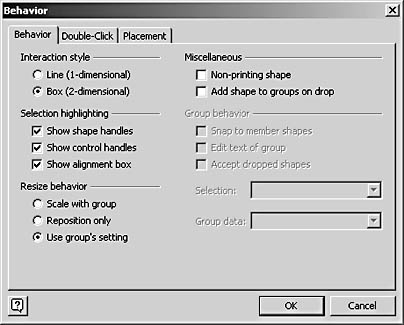 A shape that has selection handles for changing width and height is a 2-D shape, as Figure 22-6 shows. To identify a 2-D shape, select it, and then choose Shape, Behavior. If Box (2-Dimensional) is selected under Interaction Style, it's a 2-D shape.