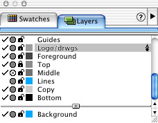 You'll notice four icons to the left of the name. A single mouse click on any of the icons switches the function off or on. The check mark indicates visibility (the Lines layer has been turned off, and any elements on it are not visible). The circle tells you whether a layer is shown in Preview or Keyline views (the Middle layer's objects are in Keyline view). The padlock icon indicates whether a layer is locked. When the padlock icon is open, objects can be placed on that layer and modified. If the padlock is closed, as the Top layer is here, nothing on that layer can be selected or moved, and items cannot be placed on that layer. Drag a color to the square icon, and elements use that color as the bounding box and other selection indicators for that layer. This is a great aid if you're trying to select something that's in a mass of layers; Alt (Option) clicking the mouse takes you down a layer at a time, and you can watch the colors change to find the layer you want. The last element in the Layers panel is the separator bar between the Background layer and the rest. Any layer below the separator bar doesn't print and is grayed-out onscreen. You can either move the separator bar above layers, or move a layer below the separator bar, the result is the same.