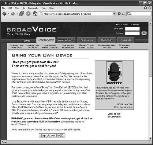 | After selecting the service provider that is the best fit for your priorities, you will want to get on board with its service plans and equipment. Fortunately, this is the easiest part. Not one of these providers would be in business if it made buying its services hard. A few Web forms or a few minutes on the phone, and you are done! Take note that you have not even considered service plans until now. This is because the most important part of the selection is the feature set, not the minutes. Most providers will zip you right to the service-plan selection, completely glossing over the technical underpinnings of their services. You may soon become disenchanted with the actual performance of the service and take off to find another, perhaps paying a substantial early-cancellation penalty as you leave. By shopping for features first, you eliminate this revolving-door experience. If you are satisfied with the features and quality of your service, you might even be willing to pay slightly more for it. In the next section, I discuss the selection of service plans, equipment, and installation support. Selecting a service planAssume for a moment that you have selected your service provider. Now it is time to drive a hard bargain by deciding which of the provider's service plans best serves your needs. As you have probably already discovered, there is not much in the way of bargaining to do; you choose the basic, middle, or deluxe plan. "Good, Better, Best" is classic marketing. Show clients a progression, and they will go deluxe every time. Take a close look at what you are getting. If you never use more than 300 minutes of calling time per month, and most of it is domestic long distance, why opt for the "Unlimited World Domination" plan? You might be better off with a 300-minute plan with low rates for additional minutes. Read the details of each plan carefully to see how it applies to your real-world situation. Buy the one that gives you the best value for your pattern of use. Choosing your equipmentMost VoIP providers offer a free telephone adapter or network interface unit for their services. You might be able to choose other optional equipment. These devices usually cost a bit more but may be well suited to your situation. If you wander about during calls, you might choose the wireless handset option offered by your provider. If you do not have a broadband router, you might choose to purchase the router with integrated phone ports. Look over the available options, and select the device that best serves your needs. Bring Your Own Device (BYOD)Some services allow you to use your own telephone adapters and IP phones. If you currently have one of these devices, check your provider's ability to support compatible codecs and protocols. If they allow BYOD, most providers offer you the choice to use your own equipment on the device-selection page of their sign-up process (Figure 2.2). You often receive a discount on your service-activation fee if you use your own equipment. Figure 2.2. BroadVoice's BYOD sign-up page Retail Starter KitsSome providers also offer retail startup kits for purchase at major computer retailers. With the purchase of one of these kits, it is possible to buy and activate your service in a single day. If this option appeals to you, be sure you select your provider before you enter the store. Standing there staring at two kits is not the time to make this decision. (My apologies to those who picked this book up from the rack next to their starter kits.) Starter kits usually include a telephone adapter or broadband router with voice ports (Figure 2.3), cables for connecting to your computer and Internet service, and a quick-start guide. By following the instructions in the guide, you can install and activate your service in as little as 15 minutes. Figure 2.3. The D-Link DVG-1120 is provided with some AT&T CallVantage starter kits. Preactivated DevicesIf you choose to sign up online, the device you select will usually be preactivated by your VoIP provider. When you receive the device, all you have to do is plug it in. This can simplify installation, especially for those who really dread making network devices talk to each other. Preactivated hardware is also more likely to be up to date with regard to device programming for best reliability and performance. Retail starter kits may have been on the shelf for a while and might need a firmware update (discussed in Chapter 6) to fix minor performance and stability issues. Considering installation assistanceMost VoIP providers can assist you with setup and configuration of your service. Often, this involves a telephone support call to make sure that everything is installed and connected correctly. Retail stores may offer to install your retail starter kit for a fee. If you are not technically inclined, this might be an excellent option for you. The store will send a technician out, and he or she will leave you with a functioning telephone service. Cable providers often require you to use their professional installation services. If this is the case, hold out for free or discounted installation. If you stick to your guns, the sales representative will often throw it in as a sign-up incentive. Just be sure to mention that you are considering other VoIP services as well. Softphone providers usually do not offer installation assistance, but you can find many helpful folks in their online forums who can assist you with your service. These online communities are frequented by some very generous and helpful people. Be sure to thank them publicly in the forums unless they request that you refrain from doing so. Lest you despair, don't forget that Chapter 4 is coming up soon. That chapter gets into network hookups and installation of VoIP devices in depth and should answer any questions you still have at this point. |