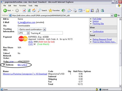 | If you still feel uncomfortable with an order even after talking to the customer, ask him for payment in advance. And if you're hit with a fraudulent order, document all contacts. This will give you greater protection and a better fighting chance of getting your money or product back. Remember it takes a lot of orders to replace just one order lost to fraud. So, it's better to pass on the ones that you're not 100% certain about. So follow these tips and protect your business. No one else will! Using Yahoo! Risk Tools to Prevent Future Fraud Orders So what should you do when the order is an actual fraudulent order? To help prevent additional fraudulent orders from the same person, Merchant Solutions has built-in risk tools such as the IP blocking tool. An IP address is a set of numbers unique to the computer that placed the order. It allows for communication between sender and receiver. You can block a specific IP address or a range of IP addresses. Although this will not guarantee that the same person will not attempt do it again from another computer, it will surely slow him down and hopefully make it not worth the trouble to try it again. Every order includes the IP address of the computer used to place the order, as seen in Figure 14.9. If the order is fraudulent, take the IP address displayed in the order and add it to the list of blocked IP addresses. Figure 14.9. Each order will include the IP address of the computer the customer used to place the order. To block an IP address 1. | In Store Manager, click on the Risk Tools under the order settings column.