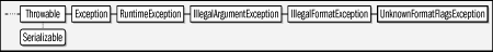 An IllegalFormatException of this type is thrown by a Formatter when unknown flags are specified in a format string. Figure 16-66. java.util.UnknownFormatFlagsExceptionpublic class UnknownFormatFlagsException extends IllegalFormatException { // Public Constructors public UnknownFormatFlagsException (String f ); // Public Instance Methods public String getFlags ( ); // Public Methods Overriding Throwable public String getMessage ( ); } |