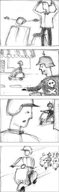 Create storyboards. Another step in producing a good fictional movie is creating storyboards: shot-by-shot sketches of what you want to shoot (Figure 2.1). In fact, you can use storyboards for documentary-style shooting, too. The point of storyboarding is to formulate your idea of what to shoot before you actually shoot; this process will save you time and help ensure that you're capturing all the visuals you want. At the very least, make a list of things you want to shoot, even if you're grabbing vacation video. Figure 2.1. Drawing up a storyboard will help you visualize your shots and save time. If you're shooting casually or on the go, create a list of shots you want to try to capture. (Your storyboards are likely to run left-to-right, like most, but I'm working in a vertical layout here.)  Prepare your equipment. Do you have plenty of MiniDV cassettes? Spare batteriesand are they charged? Power cord or battery charger? Lens cleaning cloth? Tripod? "Going to shoot video" can simply mean bringing your body and camcorder; or, it can involve hauling truckloads of equipment. In either case, make sure you have what you'll need to accomplish the job. |
