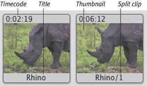 | If you're casually flipping through this chapter, I'll understand if you skip everything elseexcept this section. It's important to understand how iMovie handles clips as you're working with them, especially when you begin deleting unused clips. Clips can be made up of either video footage or imported still pictures. Each clip includes a thumbnail image of the clip's first frame, a timecode noting the clip's duration, and a title that you can edit (Figure 7.19). Figure 7.19. Each clip contains a thumbnail image of the first frame in the video. If a clip has been split, iMovie adds a number to indicate it's a section from the original. When you import footage, iMovie creates a new clip for each scene, which also adds a new clip file to your hard disk. However, even if you rename, split, or otherwise edit a clip in iMovie, the media file stays the same (Figure 7.20). iMovie actually records only the changes made to the clip, and doesn't alter the clip's original media file. Figure 7.20. The original clip, "Clip 313.dv," was renamed "Rhino" and split into four separate clips, but the Clip 313.dv source file located in the project's package on the hard disk is not renamed or split. This clip management style comes in handy in several ways as you use iMovie. Advantages of iMovie's method of managing clips