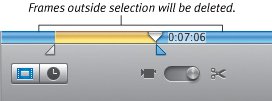 | Tips | You can click and drag at any point on the Scrubber Bar to make a selection; you don't need to drag the crop markers from the left side of the bar. Click on another clip or at the top of the Timeline Viewer to deselect the frames. You can also choose Select None from the Edit menu (Command-Shift-A). If you move the right crop mark past the left crop mark, it becomes the left mark (Figure 8.28). However, if you use the Shift-click method, the selection is extended in the direction based on which crop mark is closest. Figure 8.28. Dragging one crop marker past the other swaps their positions (right becomes left, or left becomes right). This allows you to make a different selection in only one mouse move instead of several.  With a selection made on the Scrubber Bar, choose Select All from the Edit menu (or press Command-A) to highlight all the frames in the clip; conversely, choose Select None from the Edit menu (or press Command-Shift-A) to cancel your selection. This only works when you have a single clip selected; otherwise it selects or deselects all clips in your movie.
