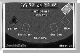 CARD GAMES PACK ONECard Games has five popular Vegas style card games in one ApplicationBlackjack, Poker, Solitaire, Red Dog, and HiLo. The graphics and animations are nice and it's easy to use. URL: http://www.javatekmedia.com/cardPackOne.jsp Price: $19.99 Trial: No Figure 14.9. Card Game Pack One is perfect for you card game lovers.