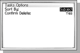The Tasks application only has two options available. Like every other application, you can disable the confirmation dialog that is shown when deleting items. Do this by changing the Confirm Delete option to No. note Sorting by due date may be useful, but there is no way to differentiate the tasks with a due date and those without. The other configurable option is the Sort By option. This option changes the order that tasks are shown in the Tasks List. The four choices correspond to the field that is used to do the sorting. They are Subject (also called Name), Priority, Due Date, and Status. The way each task is displayed in the list doesn't change, just the way they are sorted. |