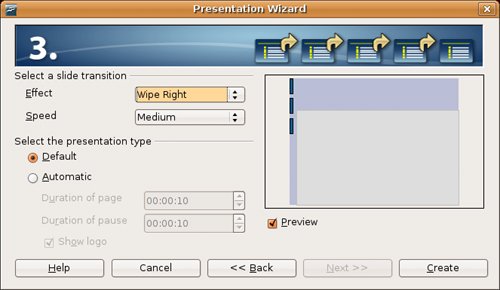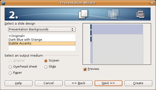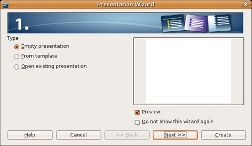 | After having worked with OpenOffice.org's Writer and Calc, you should feel right at home when it comes to using Impress. Working with menus, inserting text, spell checking, and customizing your environment all work in exactly the same way. The editing screen is probably more like Calc than Writer in some ways. The Impress work area has tabbed pages so you can easily jump from one part of the presentation to the other. Each page is referred to as a slide. Given the history of business presentationsspecifically, the making of these 35-mm slidesit's probably no wonder that we still use the same terms when creating presentations with software like Impress. To start Impress, go to the Application menu on the top panel and select OpenOffice.org Impress from the Office submenu. You can also start a new presentation from any other OpenOffice.org application, such as Writer or Calc. Just click File on the menu bar, select New, and choose Presentation from the submenu. When you start up Impress for the first time, the Presentation Wizard appears and you are presented with a number of choices. You can start with an empty presentation (see Figure 15-1), work from a template, or open an existing presentation. Incidentally, some earlier versions of OpenOffice.org started with a blank page. You have the opportunity to select this behavior by clicking the Do Not Show This Wizard Again check box. Figure 15-1. Starting a new presentation with the Presentation Wizard. Quick Tip