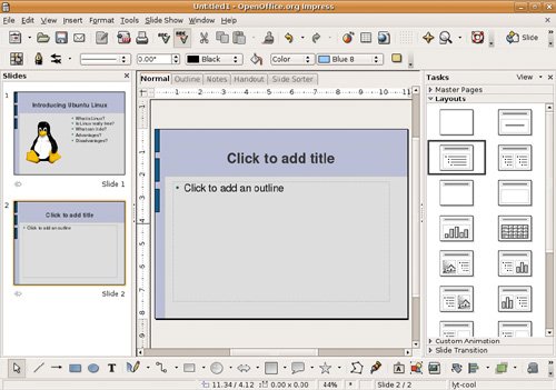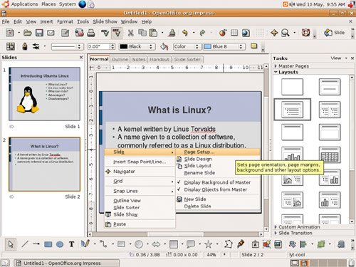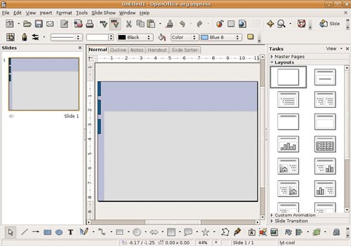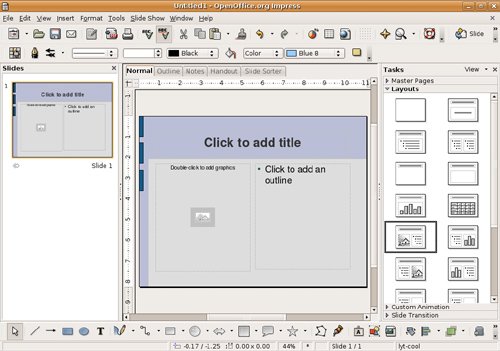 The Presentation Wizard allows you to select from existing presentations, as well as templates. For the moment, I'm going to stick with the very basics. Leave Empty Presentation selected, and click Next. Essentially, this starts us off with a blank slide. Step 2 gives us the opportunity to select a slide design (see Figure 15-2). You may find a few options for slide design here (these would be your templates). Choose <Original>. Before you click Next, pause first and have a look at the options for output medium. By default, Impress creates presentations designed for the screen (or a projector connected to your PC). Figure 15-2. Impress defaults to creating presentations designed for the screen. Step 3 lets you define the default means for slide transition (see Figure 15-3). You've seen these transitions; as someone shows a presentation, slides dissolve to show the next one or fly in from the left or drop like a trap door closing. At this stage of the game, pick one of these effects from the Effect drop-down box, and then choose the Speed of that transition. On the right side, there is a preview window that shows you what the effect looks like when you select it. Figure 15-3. Selecting slide transition effects. Directly below the slide transition selection, you select the presentation type. Your choices are Default and Automatic. By default, transition from slide to slide is done by pressing a key, whether it is <Enter> or the spacebar (you can define this). Presentations can also run without any intervention from the person giving the presentation. By selecting Automatic, you can define the amount of time between slides or between presentations. Accept the default setting here and click Create to start building your presentation. Now we have everything we need to start working on our presentation. Impress opens to a blank page that is divided into three main panes or frames (see Figure 15-4). On the left, small previews of all your slides are displayed (just a single blank one at this moment). If you chose a background, it is used in the slide previews. As you work, you can quickly move to any slide you want by scrolling down the lists and clicking the slide. Below each preview is the slide's title. By default, the title is Slide, followed by the slide's number in sequence. If you don't like this naming convention, you can easily override it by right-clicking the title and selecting Rename Slide. Figure 15-4. Selecting your slide layout. To the right, another pane is visible with a number of potential slide layouts having small preview images. This is the Tasks pane and it is further divided into four sections: Master Pages, Layouts, Custom Animation, and Slide Transition. By default, the Layouts section is open. From here, you can decide the appearance of the slide, the number of columns, title locations, and so on. If you pause over one of the images with your mouse cursor, a tooltip appears, telling you a little about the layout format. Finally, there's a rather large central pane with five tabs labeled Normal, Outline, Notes, Handout, and Slide Sorter. The normal view is where you do most of your work, creating and editing slides. The Outline view is a kind of bird's eye overview of the whole presentation. You can reorder slides, change titles, and so on. The Notes view does pretty much what you expect; it provides an easy way to add notes to the slides. The Handout view is, I think, very handy. Sometimes, when you are doing a presentation, you are expected to provide printouts of the slides for those in attendance. With Handout, you can define how those printouts look and how many slides fit on a single page. Finally, we have the Slide Sorter, which is just a larger version of the Slides preview pane on the left. With a larger area, sorting slides is just that much easier. For now, we will be working with the Normal view. You might notice that the various toolbars and menus have some resemblance to those of both Writer and Calc (discussed in the last two chapters). The menu bar sits just below the title bar, and the Standard bar is directly below that. Notice that the Formatting bar has a number of different options unique to working in the Impress environment. Along the bottom is the Drawing bar, which provides quick access to objects, drawing functions, 3D effects, and so on. Let's jump right in and create a presentation. From the Tasks pane, select the Layouts section, if it isn't already open. Choose the Title, Clipart, Text layout by clicking it and it instantly appears in the main work area in the center (see Figure 15-5). Figure 15-5. Having chosen a slide design, we are now ready to start editing that slide in the central work area. At any point, you can start the slide show by clicking Slide Show on the menu bar and selecting Slide Show. Pressing <F5> has the same effect. There isn't much to see at this point, but you can do this from time to time to see how your presentation is coming along. To start editing your slide, click (or double-click for images) the section you want to change. Make your changes by typing into that area. For the title, you might enter Introducing Linux! When you are happy with your changes, just click outside of the frame area. On the right, in the frame that says Click to Add an Outline, insert these bulleted points: