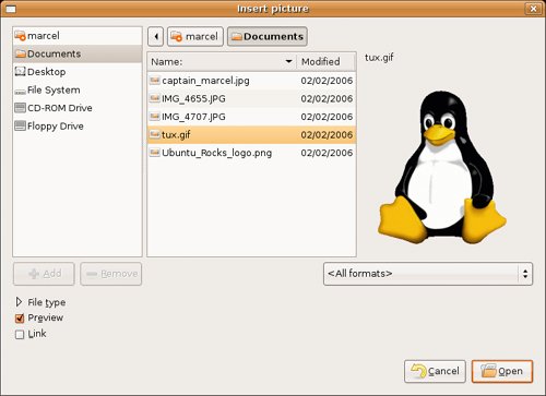 As you might have noticed, this outline serves as talking points that mirror the first chapter of this book. Now, on the left side, double-click the frame (as instructed on the default slide) and insert a graphic. The Insert Picture dialog appears, allowing you to navigate your folders and look for the perfect image (see Figure 15-6). Once again, this is a pretty standard GNOME file dialog. Take a look over on the lower left and you see a check box labeled Preview. Because you are looking for images, this is a good one to check on. The preview pane appears over on the right. Figure 15-6. Inserting a picture into the presentation. You can use any image you like here. For my image, I used Firefox to surf over to Larry Ewing's Web site (www.isc.tamu.edu/~lewing/linux/), where I picked up my Tux graphic from the source. (I'll tell you more about Tux at the end of this chapter.) You can choose another image if you prefer. When you have your image selected, click Open, and it replaces the default text in the left frame. Quick Tip