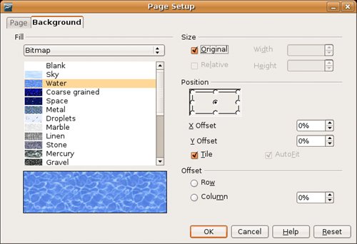 As to what to enter in the text area of each slide, I leave that to either your imagination or your memory of Chapter 1. When you have finished entering all the information you want, save your work. I'm going to show you how to dress up those plain white slides. Adding ColorRight-click your slide (not the text), and select Slide from the pop-up menu. Now click Page Setup (see Figure 15-8). Figure 15-8. Modifying the page (slide) setup in preparation for color. You see a two-tabbed window (one says Page and the other Background). Click the Background tab. Notice that it's a pretty boring page with nothing but a drop-down list labeled Fill, with None selected. Each item in the drop-down list provides an option for background selection, whether it is plain white, colors, gradients, hatching, or bitmaps. Click each to see the choices that they offer. The example in Figure 15-9 shows the Bitmap selection screen. Figure 15-9. Selecting background decorations from the Impress page setup. For example, you might choose the Linear blue/white gradient (a very business-looking background) or perhaps the Water bitmap. The choice is yours. When you click OK, you are asked whether you want this background setting to be for all slides. For now, click Yes. All right. You've done a lot of work, so save your presentation. Click File on the menu bar and select Save (or Save As) from the menu. If you choose Save As, you have the opportunity to select the presentation format, whether native OpenOffice.org OpenDocument or Microsoft PowerPoint format. Now, it's time to see the fruits of your labors. Click Slide Show on the menu bar and select Slide Show. You can also use the <F5> keyboard shortcut. The slides transition with a touch of the spacebar or a mouse click. You can exit the presentation at any time by pressing the <Esc> key. Printing Your PresentationAs with the other OpenOffice.org applications, click File on the menu bar and select Print; you can also click the small printer icon on the Standard bar. The standard OpenOffice.org print dialog appears, from which you can select your printer of choice. |