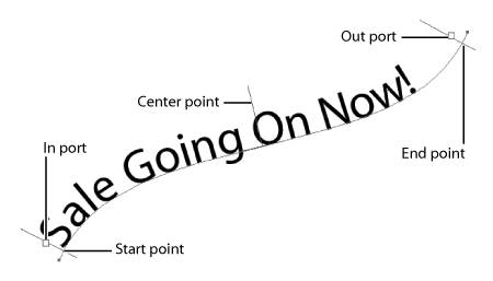 The small boxes should look familiar to youthey are in and out ports. The ports are there because Illustrator treats type on a path like area type. The two vertical lines that appear on either end define the boundary, or the start and end points, of the text. The line in the center determines the center point between the start and end points and allows you to specify which side of the path the text sits on. You can use the in and out ports to thread text across multiple Path Type objects, and you can even create a thread of text that includes both Path Type and Area Type objects (très cool). By dragging the start and end points, you can define the area of the path that can contain text. For example, you can have a long path, but have text appear on just a small portion of that path (Figure 6.17). If you think about it, adjusting the start and end points on a Path Type object is akin to adjusting the width of an Area Type object. You can also drag the middle line to either side of the path to flip the text. Figure 6.17. By moving the position of the start and end points, you can control the portion of the path that can contain text.