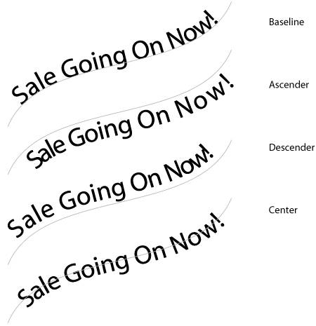 If you want to apply an appearance to the path itself on a Path Type object, click just the path with the Direct Selection tool (it might be easier to do this while you are in the Outline view mode). You can then apply attributes to the path as you would normally. To offset text from the path itself, use the Baseline Shift setting, although if you're working with wavy or curved paths, using one of the Align to Path settings offers better results because it takes advantage of the Spacing setting. |