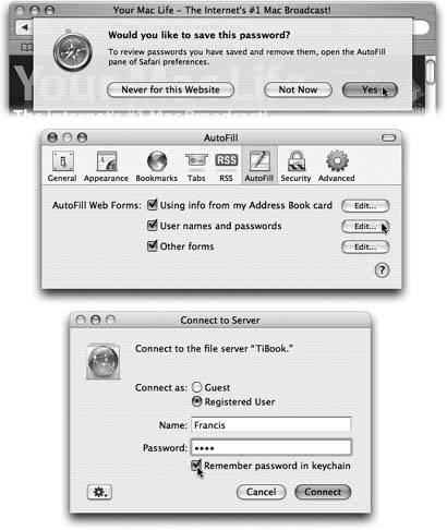 These days, all kinds of programs and services know about the Keychain and offer to store your passwords there. Figure 12-16 shows two prime examples.