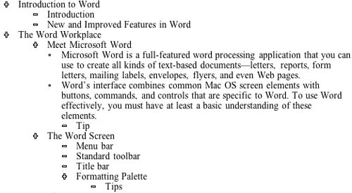 | To view only certain heading levels On the Outlining toolbar (Figure 6), click the button that corresponds to the lowest level of heading that you want to display. The outline collapses or expands to show just that level (Figures 31 and 32). Figure 31. In this example, the Show Heading 3 button was clicked to display heading levels 1, 2, and 3. Figure 32. In this example, the Show Heading 2 button was clicked to display heading levels 1 and 2. To view all heading levels On the Outlining toolbar (Figure 6), click the Show All Headings button. The outline expands to show all headings and body text (Figure 33). Figure 33. Choosing Show All Headings displays all levels of headings and the body text. To display only the first line of every paragraph Click the Show First Line Only button on the Outlining toolbar. The Outline view changes to display only the first line of each heading and paragraph of body text (Figure 34). Figure 34. Turning on the Show First Line Only button displays only the first line of each heading or paragraph of body text. Tip The Show First Line Only button works like a toggle switch. When turned on, only the first line of every paragraph is displayed. When turned off, all lines of every paragraph are displayed. This button is turned off by default. To hide formatting Click the Show Formatting button on the Outlining toolbar. The Outline view changes to display all headings and body text in the default paragraph font for the Normal style (Figure 35). Figure 35. Turning off the Show Formatting button displays all text in the default paragraph font for the Normal stylein this case, 12-point New Times Roman. Tip The Show Formatting button works like a toggle switch. When turned on, paragraph formatting is displayed. When turned off, all text appears in the default paragraph font for the Normal style. This button is turned on by default. |
