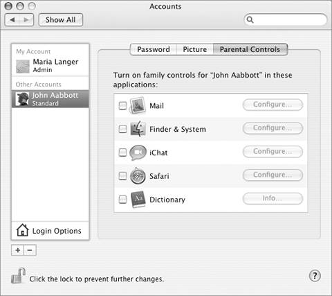 Family Controls (Figure 5) enable you to set up user accounts to protect kids from interacting with strangers or visiting unapproved Web sites on the Internet. Figure 5. Parental Controls enable you to limit the use of certain applications.