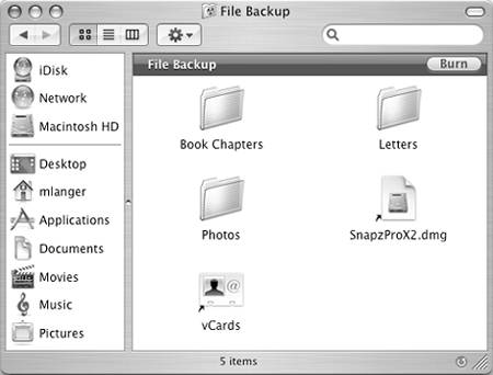 VoiceOver is Mac OS X's new built-in screen reader, which uses voice synthesis to read back whatever appears on screen, as well as what you type or click. Finder Smart folders work with Spotlight to create folders full of search results. Smart folders are constantly updated, thus automating the search process. Burn folders (Figure 6) make it easy to organize files to be burned onto a CD. Because burn folders contain aliases of items, there's no need to fill your hard disk with duplicate items. Best of all, when an item changes, the current version of the item is burned to CD. Figure 6. Burn folders make it easy to organize files before burning them to CD.