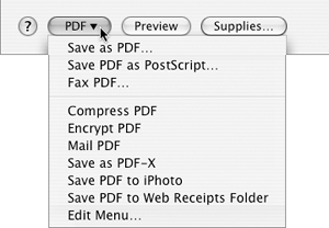 Address Book has several new features, including Smart Groups, which automatically group contacts by search criteria you specify, and Address Book Sharing, which enables you to share contacts with others over a network or the Internet. iCal is better integrated with Address Book and Mail. You can now use iCal to send event invitations to Address Book contacts via Mail. Printing The Print dialog now includes a PDF menu (Figure 8), which offers options for creating or faxing document PDFs. Figure 8. The new PDF menu in Print dialogs lets you create or fax documents as PDFs.