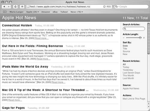 The Finder now includes a Print command, which quickly prints documents selected in a Finder window. Internet Safari can now work as an RSS reader (Figure 9), so you can browse syndicated sites. A new View All RSS Articles command displays recent RSS articles from a variety of sources in your Safari window. Figure 9. Safari is now an RSS article reader as well as a standard Web browser.