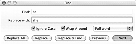 Most word processing and page layout applications include find and replace features. Although these features are somewhat limited in TextEdit, full-featured applications such as Microsoft Word and Adobe InDesign enable you to search for text, formatting, and other document elements as well as plain text.