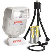 Sunpak Digital Camera Flash Enhancement KitHere's another flash unit designed for digital camera use. Sunpak's Digital Camera Flash Enhancement Kit works with any digital camera that has a built-in flash or hot shoe, and works to supplement the built-in flash. It sits on its own tripod stand and has a 200 millisecond delay for optimum flash synch. It's also quite affordable, at around $30.