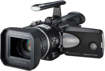 JVC GR-HD1Sony isn't the only player in the high-definition camcorder game, as witnessed by JVC's GR-HD1. This pro-level camcorder records in 720p (720 x 1280) HDV format with 16:9 aspect ratio; it can upconvert its signals to 1080i if you want, or switch to standard definition DV mode. Recording is via 1/3'' CCD; the lens is a 10X zoom. Naturally, you get all the requisite bells and whistles, all in a very solid-feeling design.