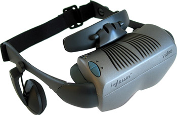 i-glasses Wearable Video DisplayI would be remiss if I didn't mention at least one heads-up video display. The i-glasses system is a head-mounted video display that connects to any portable video player or gaming system. Flip down the visor and you have your own personal video display, with 800 x 600 resolution. It's like watching a 70-inch screen from 13 feet away, sort of.