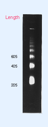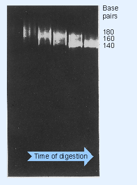 Figure 19.7 Micrococcal nuclease digests chromatin in nuclei into a multimeric series of DNA bands that can be separated by gel electrophoresis. Photograph kindly provided by Markus Noll. |