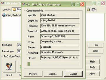 Use this hack to play your own videos as the Halo 2 demo. Altering the Halo 2 splash screen is cool, but adding your own demos to the game is even better. Creating a custom Halo 2 video involves replacing the files in the bink directory. In this example, I will replace the video used in Halo 2's attract mode. To work with the BIK file format, you can use an application developed by Rad Game Tools. To download the program, visit http://www.radgametools.com/bnkdown.htm. First, record your personal demo using your own capture technique. Once you have the video, open it in the RAD Video Tools program and click Bink It!. This will create a .BIK file based on your video (see Figure 10-13). Figure 10-13. Converting the AVI video to Bink format Once you have the file converted, simply change the name to attract_60.bik and transfer [Hack #54] it to the Halo 2/bink directory on your Xbox (see Figure 10-14). After you transfer the Bink video to your Xbox, you just need to wait for the demo reel to run (see Figure 10-15). Figure 10-14. FTP your custom demo to your Xbox Figure 10-15. A custom Halo 2 demo