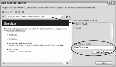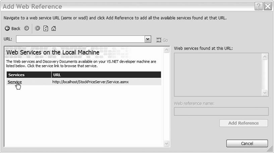 Figure 14-7. Add Web Reference![]() Figure 14-8. Choosing local web service![]() Once you click on Service, the Add Web Reference dialog will locate the service (and bring up the test page). Give your service a reference name (a name by which you can refer to it in your code) and click Add Reference, as shown in Figure 14-9. Figure 14-9. Name and Add Reference![]() When you click Add Reference, the web reference is added to your project, and reflected in the Solution explorer, as shown in Figure 14-10. Figure 14-10. Client solution with web reference![]() Switch to Design view. Enter the words Stock Ticker and highlight them. Set them to Heading 1 and center them using the toolbar controls. Move down on the page and enter the text Please enter a stock symbol:, then drag a text box into place. Name the text box txtStockSymbol. Add a button, name it btnSubmit, and set its text to Get Stock Info. Finally, add a label (lblMsg) and set its text to blank (see Figure 14-11). Figure 14-11. Running the Stock Ticker Client![]() Double-click on the button to create an event handler. In the event handler, you'll get the text from txtStockSymbol and send it to the GetName and GetPrice methods of your service. You'll then format the response and put it in the output label, as shown in Example 14-5. Example 14-5. Submit button Click event handlerProtected Sub btnSubmit_Click( _ ByVal sender As Object, _ ByVal e As System.EventArgs) Handles btnSubmit.Click Dim proxy As StockPriceService.Service = New StockPriceService.Service( ) Dim symbol As String = Me.txtStockSymbol.Text Dim stockName As String = proxy.GetName(symbol) Dim stockPrice As Double = proxy.GetPrice(symbol) Me.lblMsg.Text = "The price of " & stockName & " is " & stockPrice.ToString( ) End Sub The result is that when you put in a stock symbol and press the Get Stock Info button, the methods of the web service are called, and values are returned to your client application for display, as shown in Figure 14-11. |