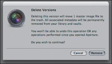 Note, too, that if you select a closed stack, even one containing dozens of images, and click Command-Delete, all versions in that stack will be deleted. If you end up deleting all of the versions associated with a particular master file, the same Delete Versions dialog box will appear. (You won't get this warning if there is another version of a master image somewhere else in your project.) Undeleting ImagesWhen Aperture deletes a master image from a project, it places it in the Finder's Trash, in a folder called Aperture. This Aperture trash folder is further divided by project name. If you want to undelete an image, you can pull it out of the Trash and reimport it into Aperture. Aperture's trashed files are deleted any time you empty the Trash. Deleted versions are not recoverable; only master files can be undeleted. |