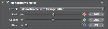 In the Monochrome Mixer controls group, choose Monochrome with Orange Filter from the Preset pop-up menu.